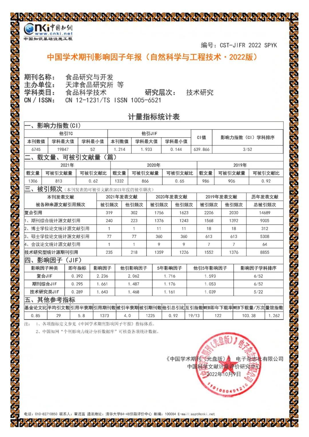 《中国学术期刊影响因子年报(自然科学与工程技术·2022版)》发布的各类期刊影响因子是度量国内期刊学术创新影响力和整体学术水平的主要指标。近年来,《食品研究与开发》期刊影响因子和引用频次均呈现逐年稳步增长态势,期刊复合影响因子由2021年的1.848上升至2022年的2.236,再创历史新高。