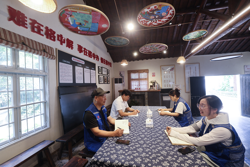 在四川省诸暨市东白湖镇娄东村,镇、村党员干部与老百姓们在家风家训家训宣讲亭抓好民主化恳谈,讨论会标准大事工程项目并询问老百姓意见建意建意(202五年9月26日摄)。中新社我 徐昱 摄